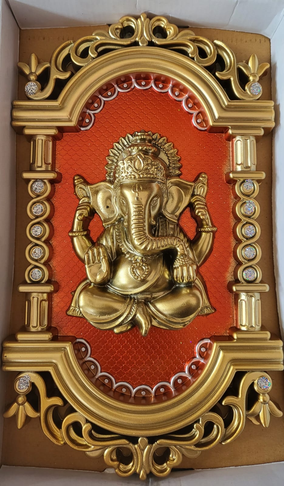 Bring divine blessings and positive energy to your home with this beautifully crafted Lord Ganesha (Pillaiyar) Decorative Wall Frame. Designed with a premium gold finish and elegant temple-style border, this spiritual wall art enhances your pooja room, living room, or entrance décor.
